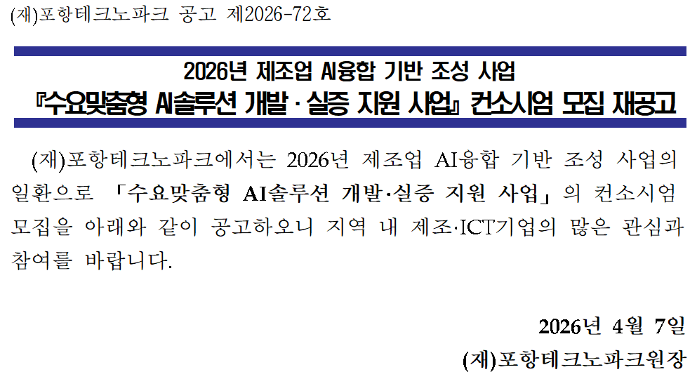 2026년 제조업AI융합기반조성사업 AI솔루션 개발·실증 지원사업(수요맞춤형) 모집 재공고