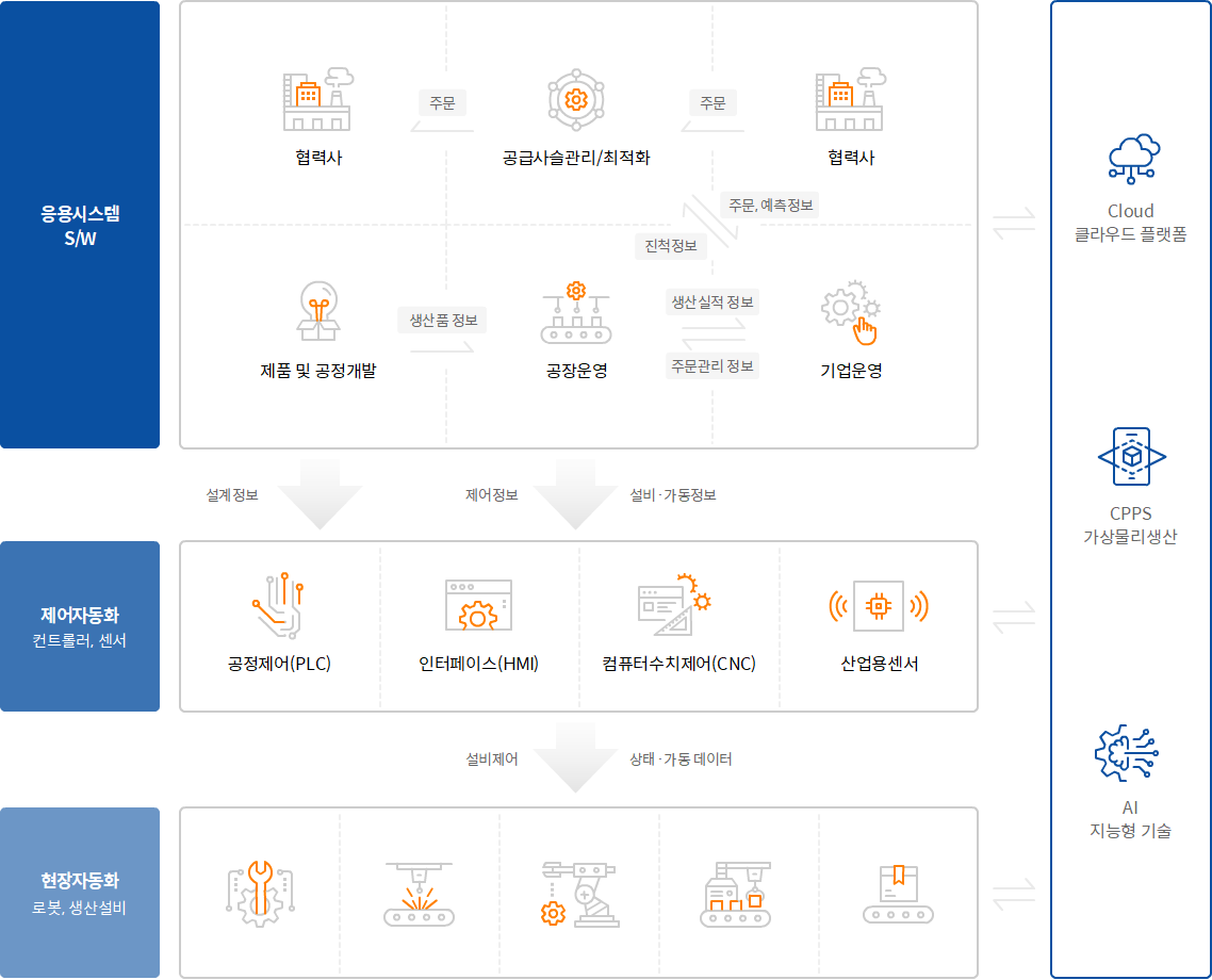 | 중간2 | 설비제어 자동화 | 실시간 공장제어 | 공장운영 통합 | 시뮬레이션과 일괄 프로세스 자동화 | 다품종 개발 협업 |