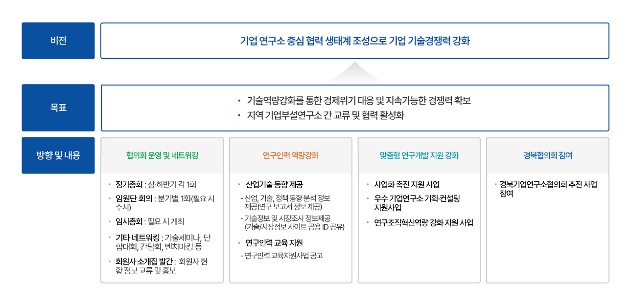 - 설립목적 : 지역 내 기업부설연구소 간 상호협력체계 구축을 통한 정보교류 활성화, 신규 사업 발굴 등 기업 연구소 기술경쟁력 강화